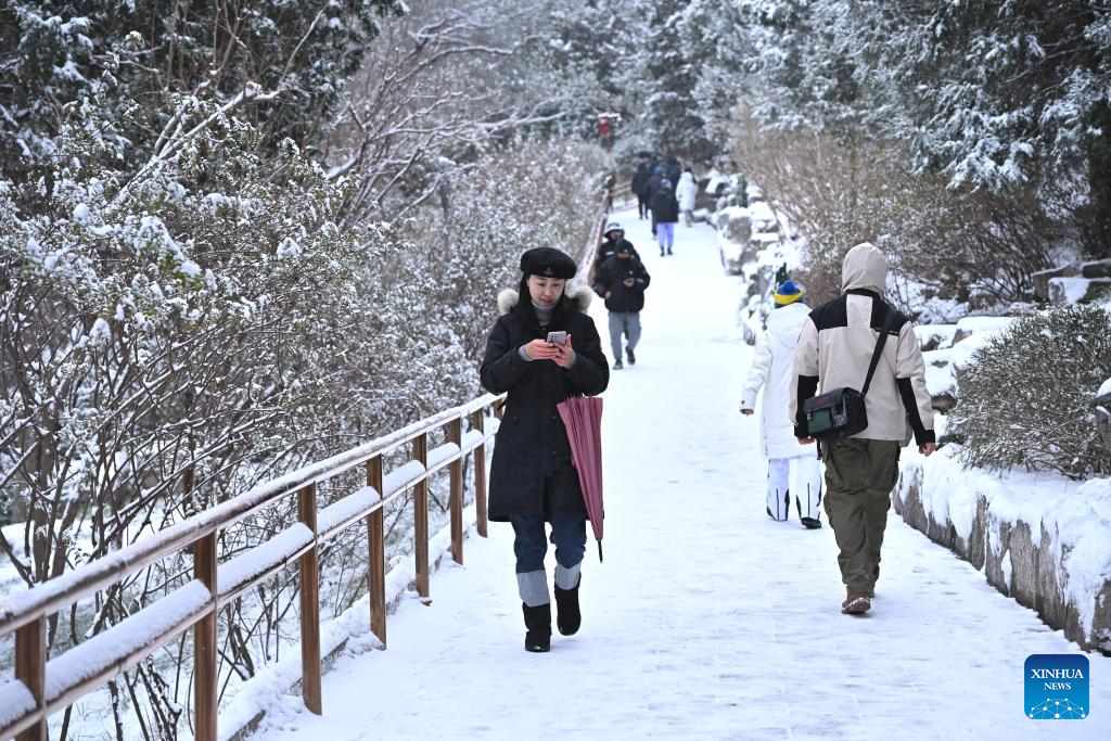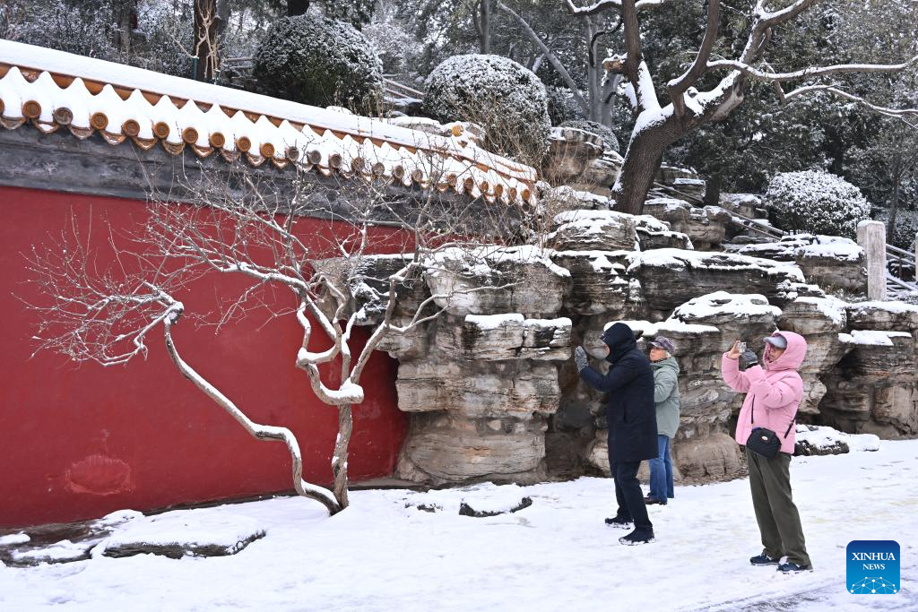 People visit Jingshan Park amid snow in Beijing, capital of China, Dec. 11, 2023. (Xinhua/Li Xin)