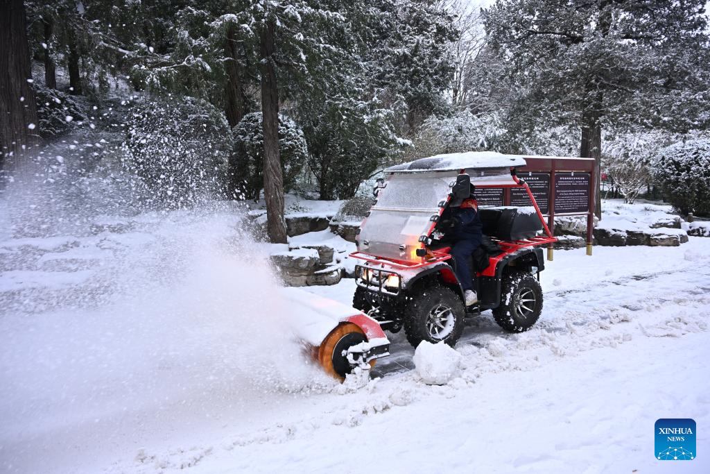 A worker removes snow with a machine at Jingshan Park in Beijing, capital of China, Dec. 11, 2023. (Xinhua/Li Xin)