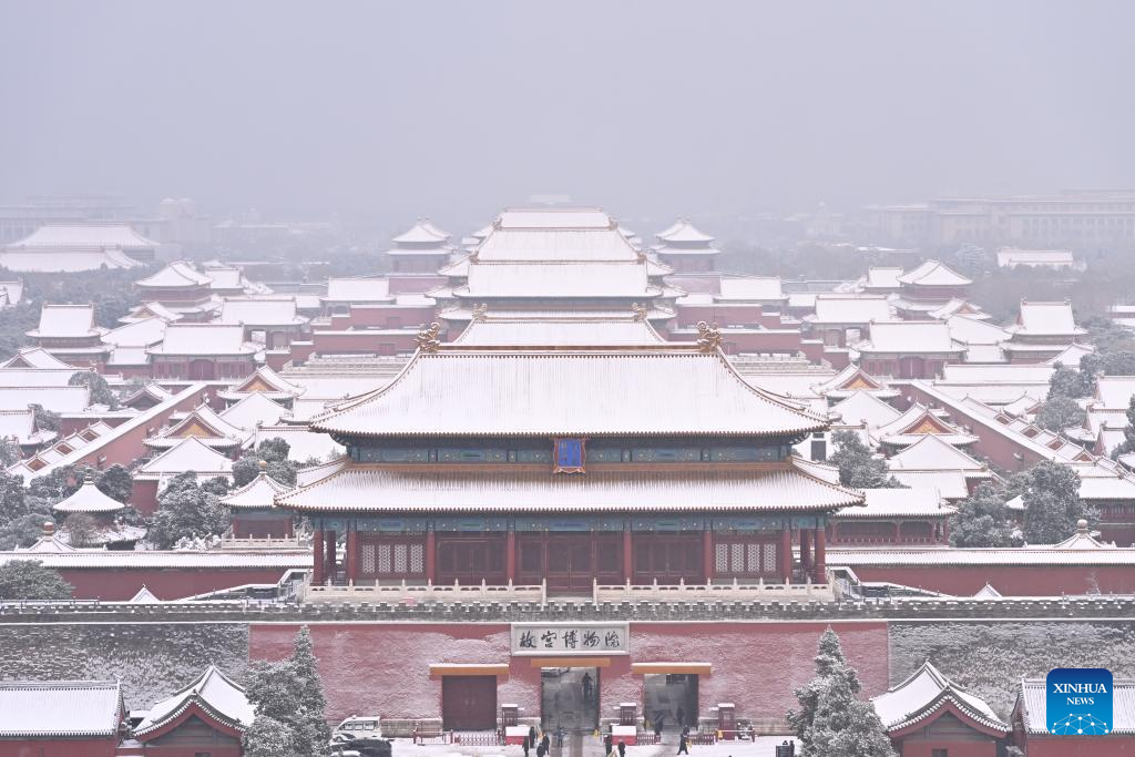 Tourists take photos of the Palace Museum amid snow in Beijing, capital of China, Dec. 11, 2023. (Xinhua/Li Xin)