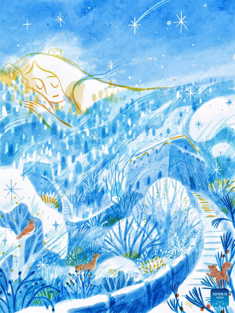 This undated file photo shows a drawing of Jiang Yige themed on the Hushan section of the Great Wall. Jiang Yige is a native illustrator of Dandong, a city noted for Hushan section of the Great Wall, widely regarded as the eastern end of the Great Wall built during the Ming Dynasty (1368-1644).
