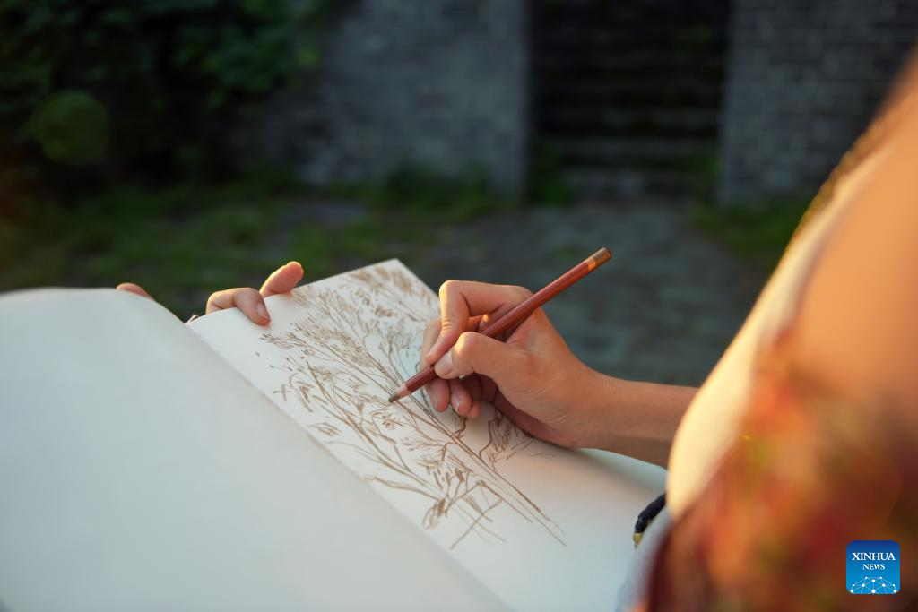 Jiang Yige prepares to go out for sketching in Dandong City, northeast China's Liaoning Province, Aug. 22, 2023. Jiang Yige is a native illustrator of Dandong, a city noted for Hushan section of the Great Wall, widely regarded as the eastern end of the Great Wall built during the Ming Dynasty (1368-1644).