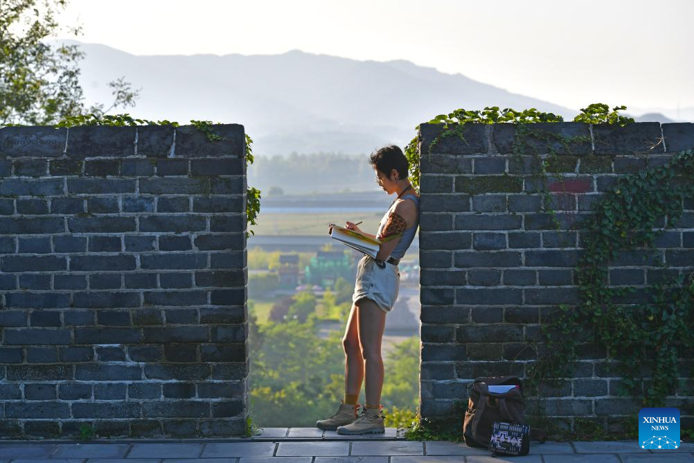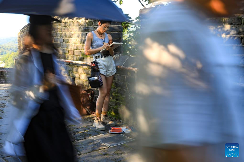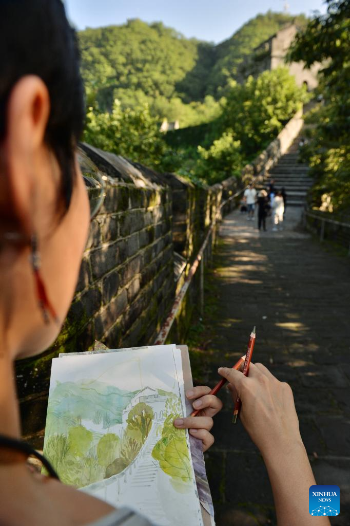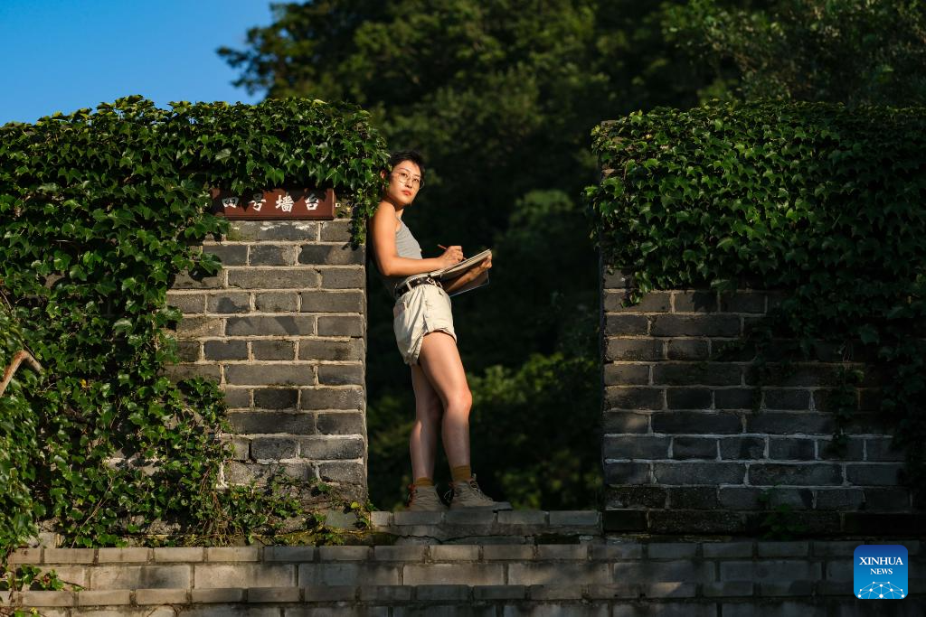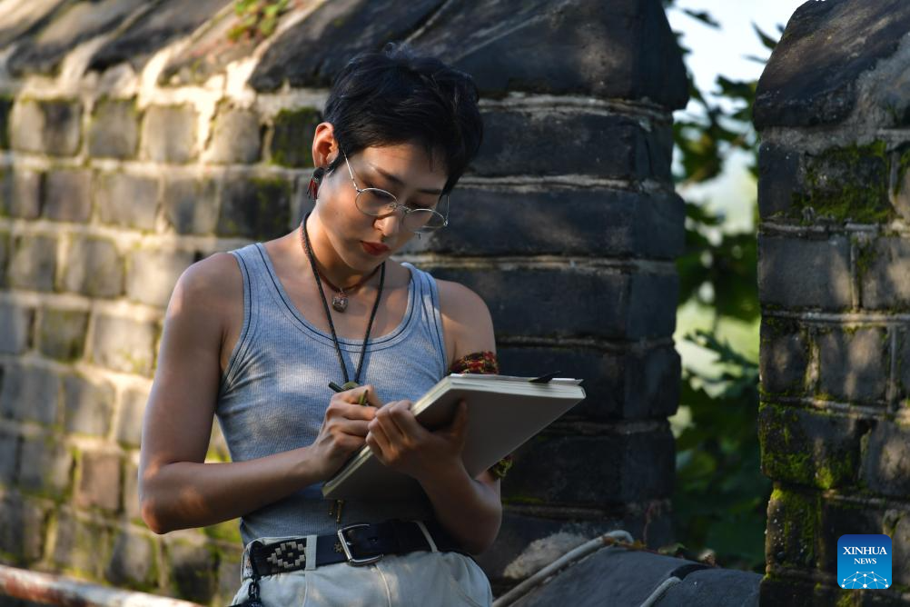 Jiang Yige creates a drawing at the Hushan section of the Great Wall in Dandong City, northeast China's Liaoning Province, Aug. 23, 2023. Jiang Yige is a native illustrator of Dandong, a city noted for Hushan section of the Great Wall, widely regarded as the eastern end of the Great Wall built during the Ming Dynasty (1368-1644).