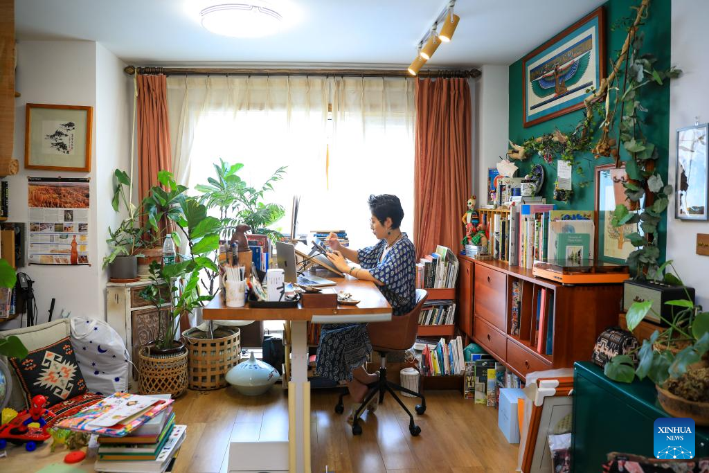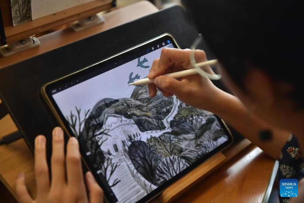 Jiang Yige retouches her drawing at home in Dandong City, northeast China's Liaoning Province, Aug. 22, 2023. Jiang Yige is a native illustrator of Dandong, a city noted for Hushan section of the Great Wall, widely regarded as the eastern end of the Great Wall built during the Ming Dynasty (1368-1644).