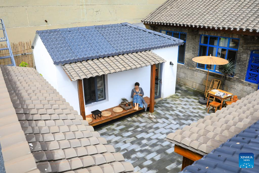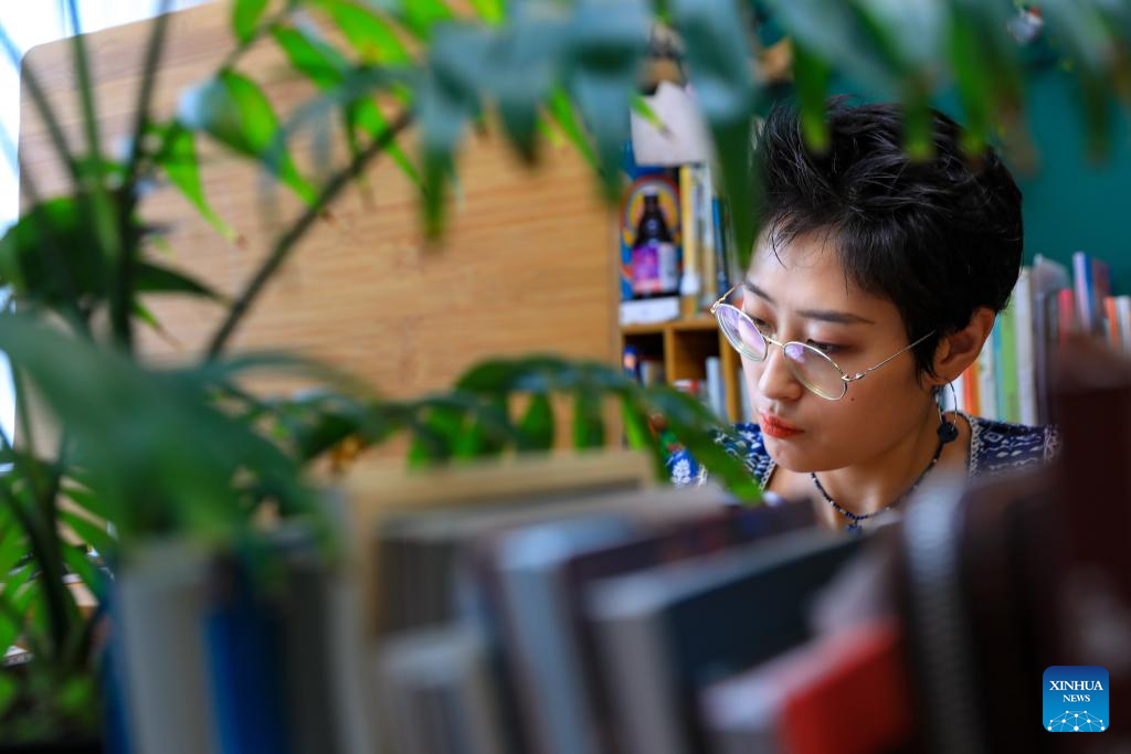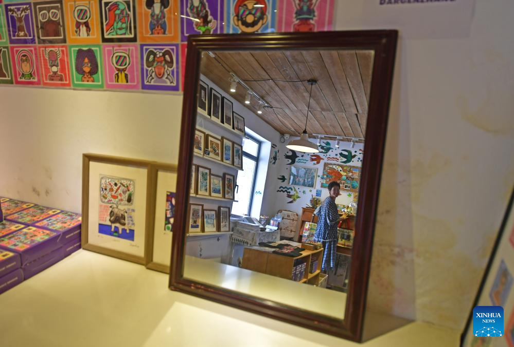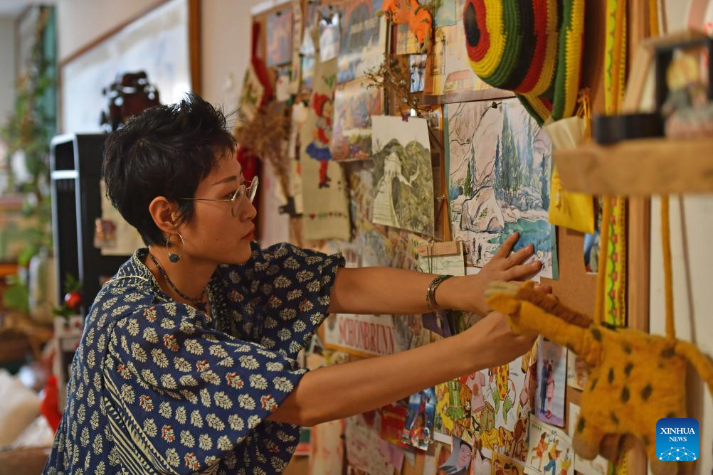 Jiang Yige sorts out cultrual and creative products at a gallery where she displays her works in Dandong City, northeast China's Liaoning Province, Aug. 22, 2023. Jiang Yige is a native illustrator of Dandong, a city noted for Hushan section of the Great Wall, widely regarded as the eastern end of the Great Wall built during the Ming Dynasty (1368-1644).