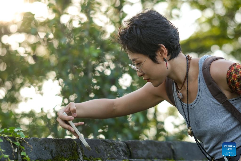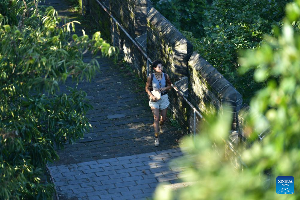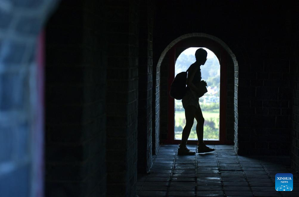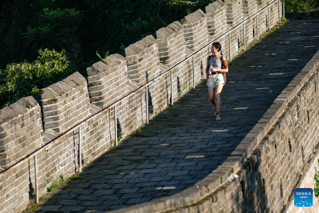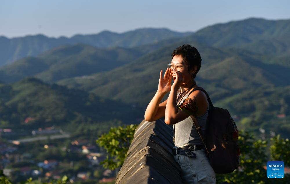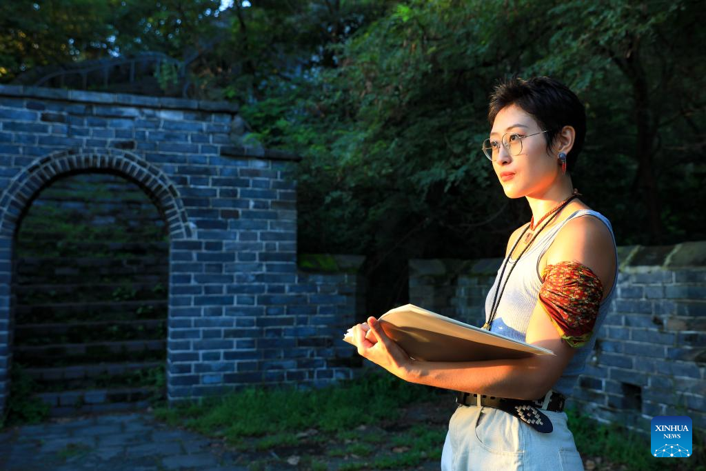 Jiang Yige visits the Hushan section of the Great Wall in Dandong City, northeast China's Liaoning Province, Aug. 23, 2023. Jiang Yige is a native illustrator of Dandong, a city noted for Hushan section of the Great Wall, widely regarded as the eastern end of the Great Wall built during the Ming Dynasty (1368-1644).