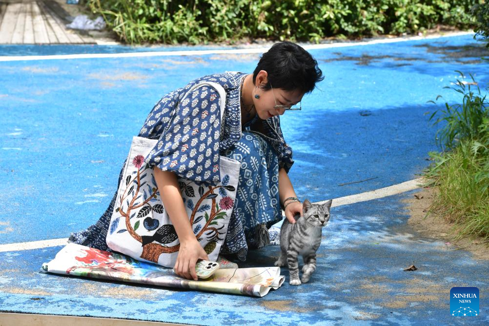 Jiang Yige interacts with a kitten at a residential compound in Dandong City, northeast China's Liaoning Province, Aug. 22, 2023. Jiang Yige is a native illustrator of Dandong, a city noted for Hushan section of the Great Wall, widely regarded as the eastern end of the Great Wall built during the Ming Dynasty (1368-1644).