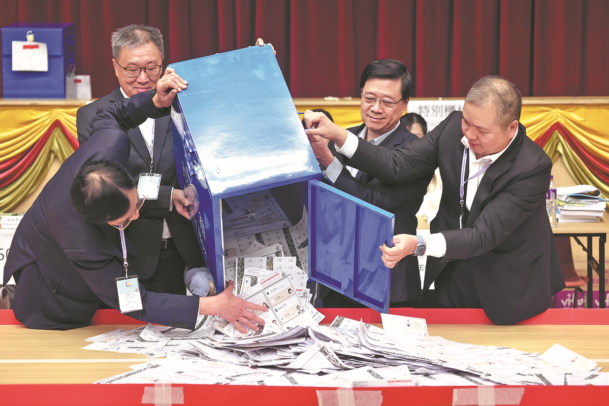 John Lee Ka-chiu (second from right), chief executive of the Hong Kong Special Administrative Region, and election officials open a ballot box used for the Hong Kong SAR's seventh District Council Ordinary Election on Monday. [EDMOND TANG/CHINA DAILY]
