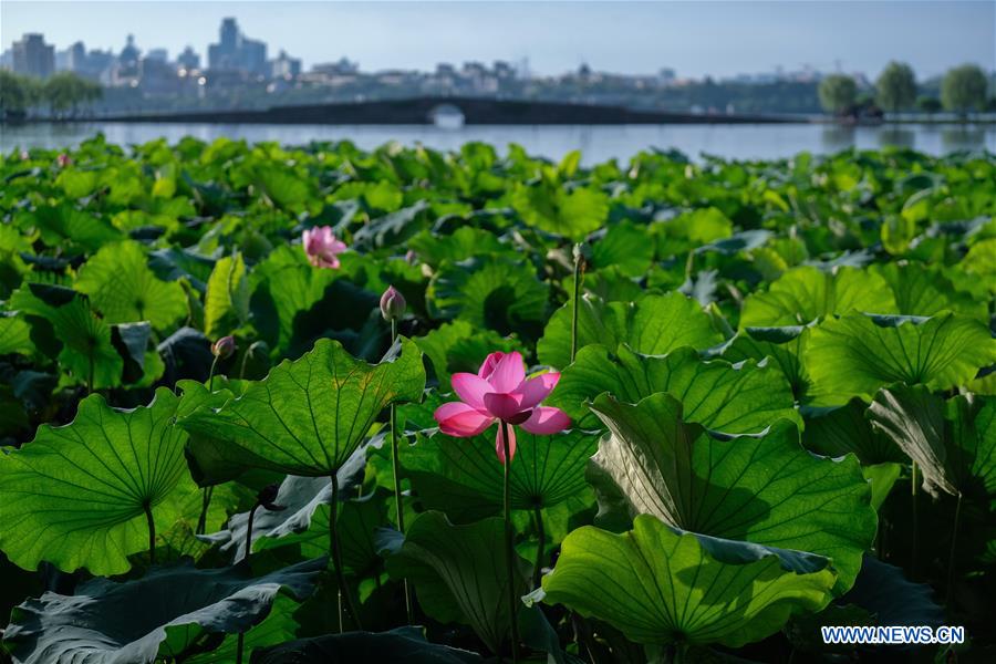 Photo taken on July 7, 2020 shows a lotus flower blossoming in the West Lake in Hangzhou, East China's Zhejiang province. [Photo/Xinhua]