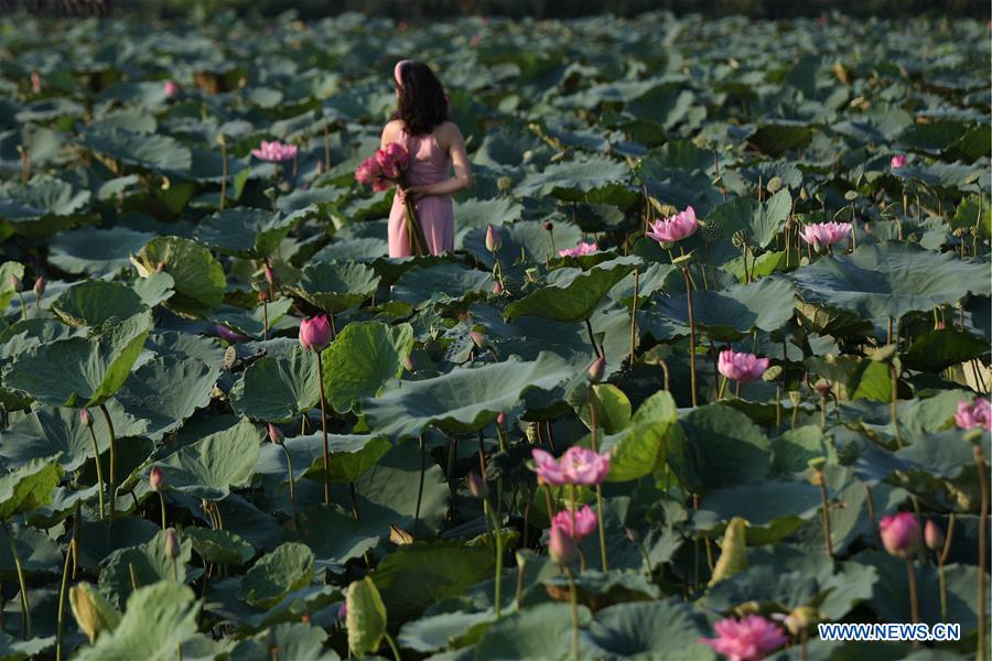 A woman poses for photos amid lotus flowers at the West Lake of Hanoi, capital of Vietnam, July 15, 2020. [Photo/Xinhua]
