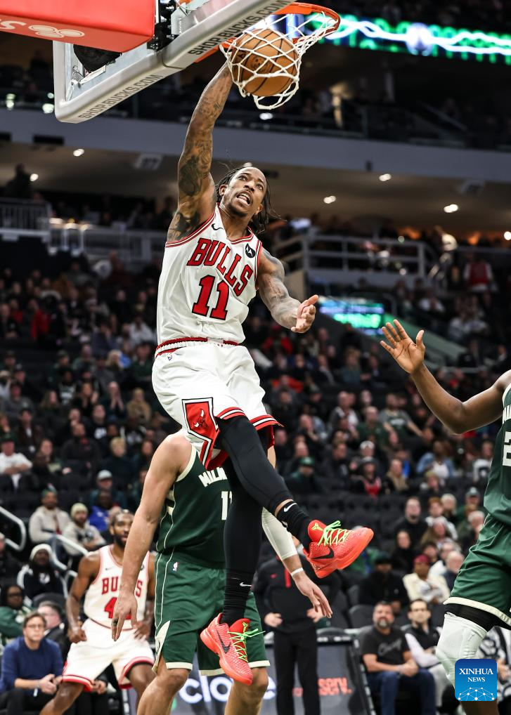 DeMar DeRozan of Chicago Bulls dunks during the 2023-2024 NBA regular season match between Milwaukee Bucks and Chicago Bulls at Fiserv Forum in Milwaukee, the United States, Dec. 11, 2023. (Photo by Joel Lerner/Xinhua)
