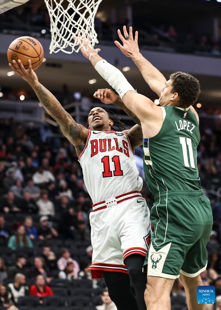 DeMar DeRozan (L) of Chicago Bulls vies with Brook Lope of Milwaukee Bucks during the 2023-2024 NBA regular season match between Milwaukee Bucks and Chicago Bulls at Fiserv Forum in Milwaukee, the United States, Dec. 11, 2023. (Photo by Joel Lerner/Xinhua)