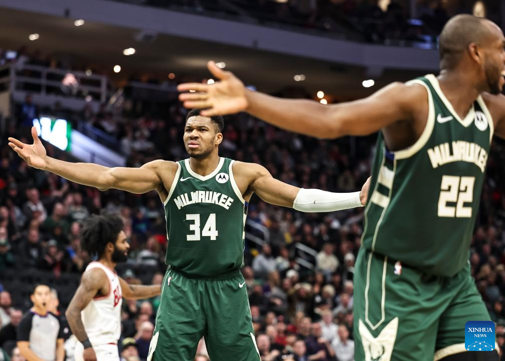 Giannis Antetokounmpo (L) of Milwaukee Bucks reacts during the 2023-2024 NBA regular season match between Milwaukee Bucks and Chicago Bulls at Fiserv Forum in Milwaukee, the United States, Dec. 11, 2023. (Photo by Joel Lerner/Xinhua)