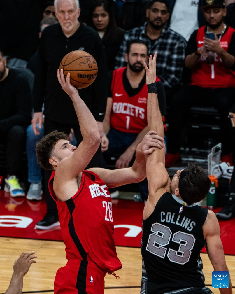 Alperen Sengun (L) of Houston Rockets goes for a layup during the 2023-2024 NBA regular season match between Houston Rockets and San Antonio Spurs in Houston, the United States, on Dec. 11, 2023. (Photo by Chen Chen/Xinhua)