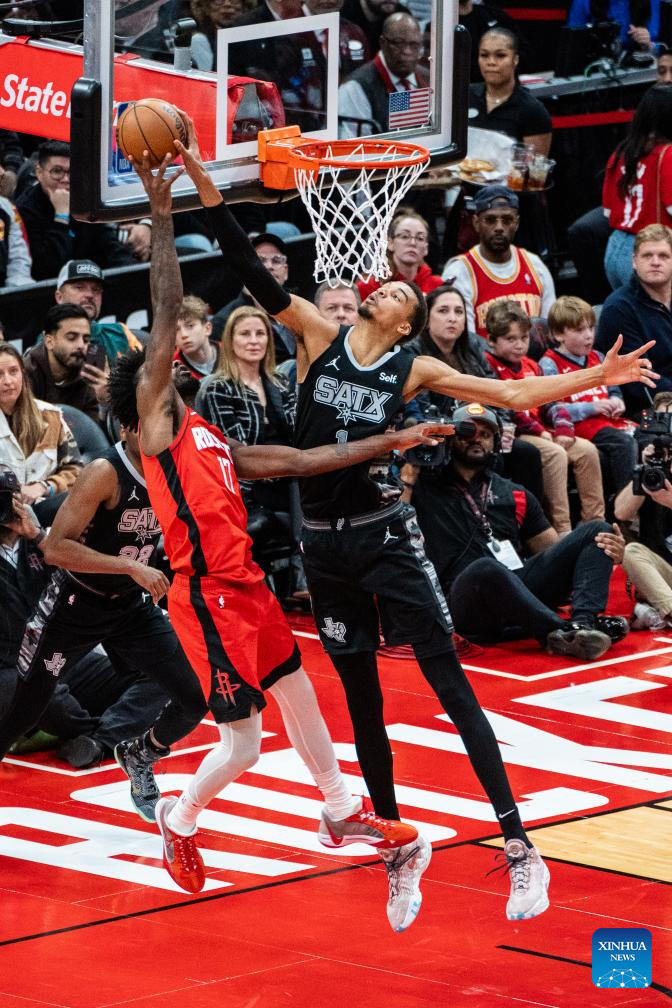 Victor Wembanyama (R) of San Antonio Spurs blocks the ball during the 2023-2024 NBA regular season match between Houston Rockets and San Antonio Spurs in Houston, the United States, on Dec. 11, 2023. (Photo by Chen Chen/Xinhua)