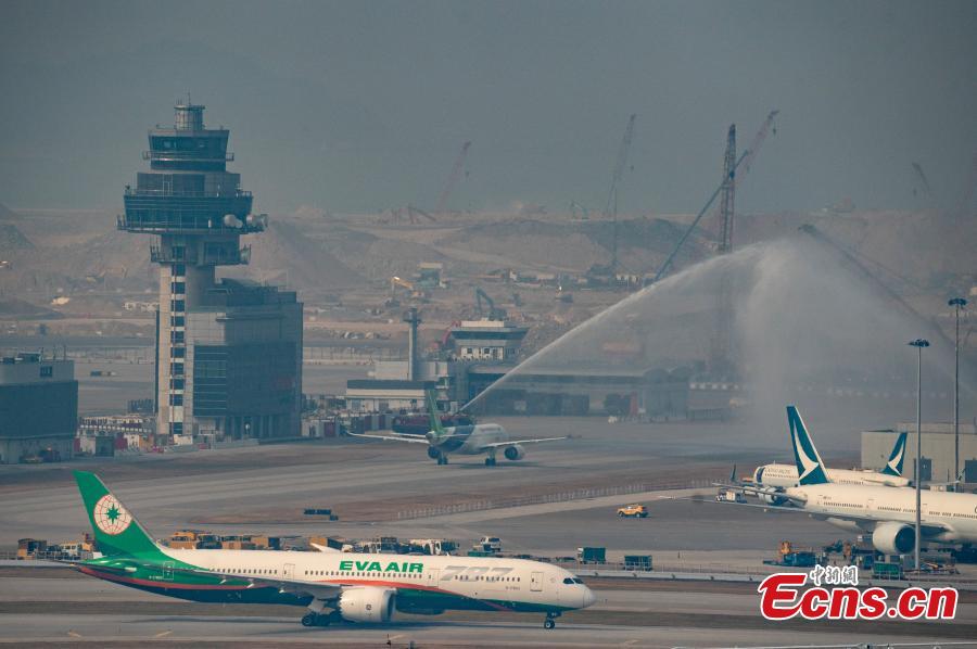 An ARJ21, domestically developed Chinese passenger jetliner, passes through a water gate at Hong Kong International Airport in the Hong Kong Special Administrative Region, Dec. 12, 2023. (Photo: China News Network/Yin Liqin)