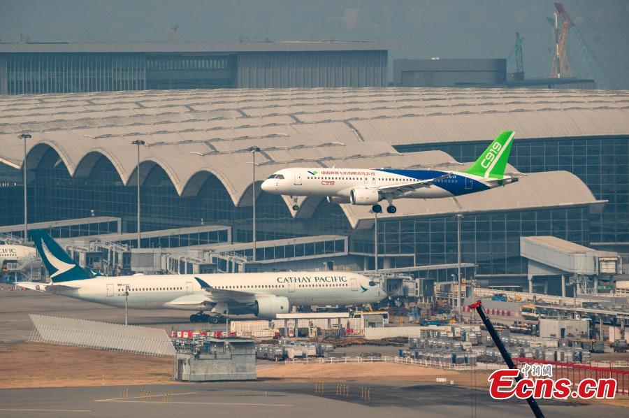 A C919, China's self-developed large passenger aircraft, lands at Hong Kong International Airport in the Hong Kong Special Administrative Region, Dec. 12, 2023. (Photo: China News Network/Yin Liqin)