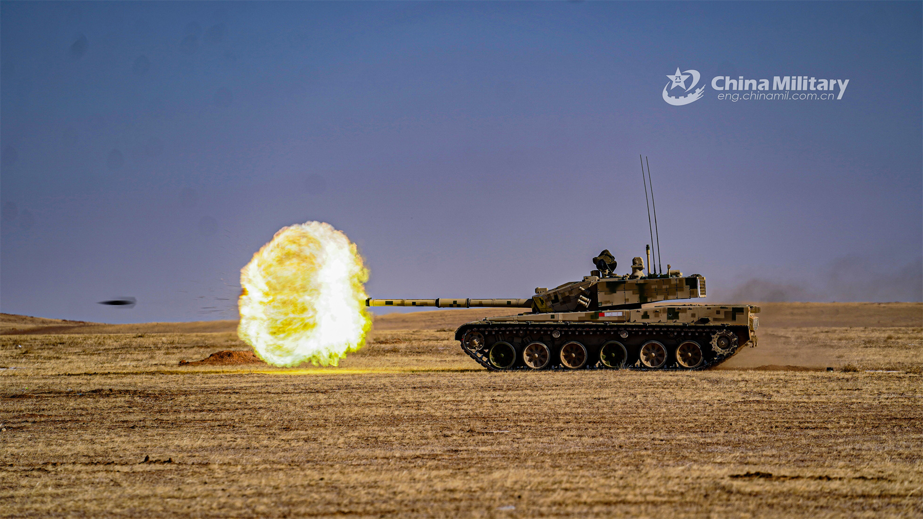 A main battle tank (MBT) attached to a brigade under the PLA 81st Group Army fires at simulated targets during a live-fire exercise in late November, 2023. (eng.chinamil.com.cn/Photo by Li Changxing)