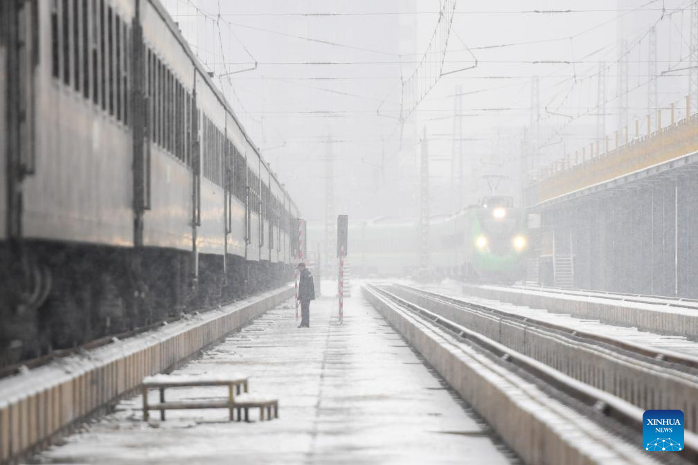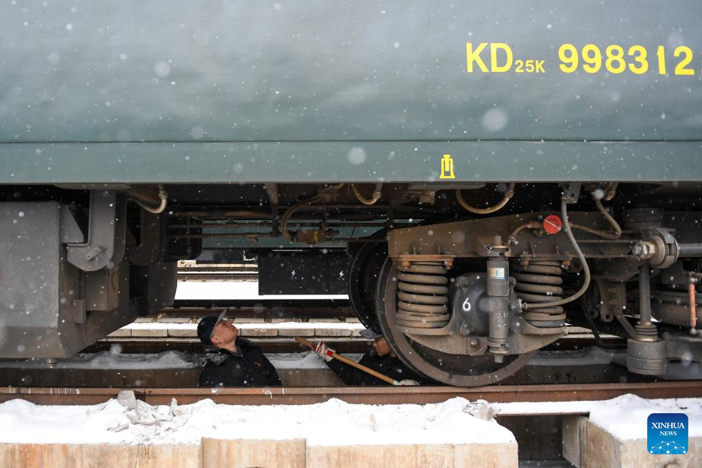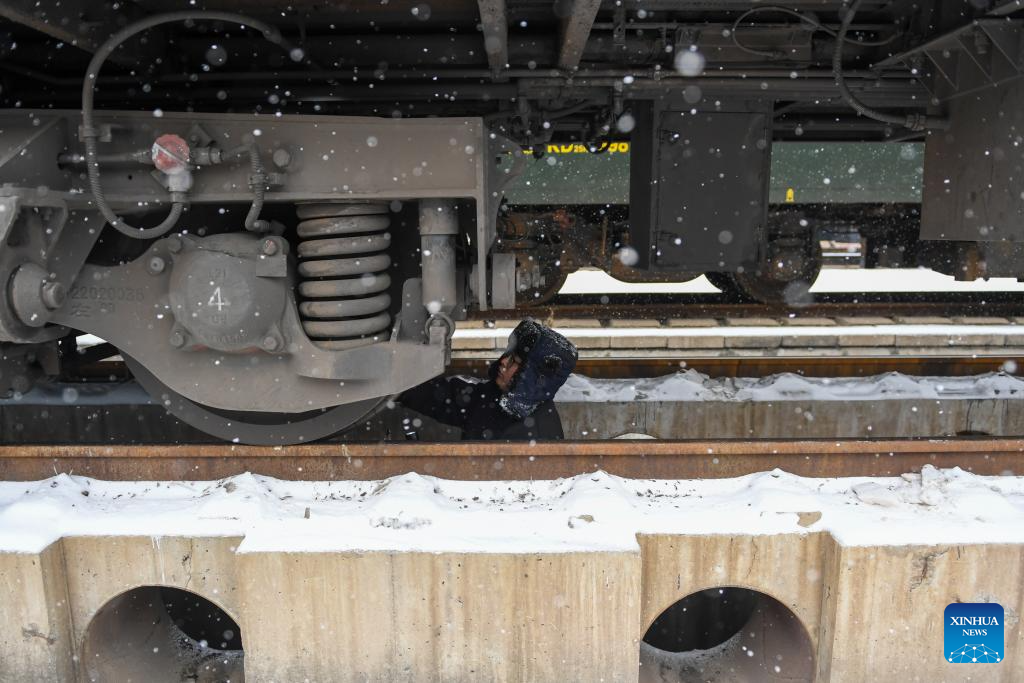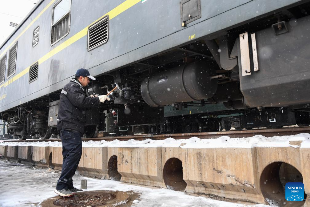 A staff member examines a train in the snow at a car depot of China Railway Beijing Bureau Group Co., Ltd. in Beijing, capital of China, Dec. 13, 2023. (Xinhua/Ju Huanzong)