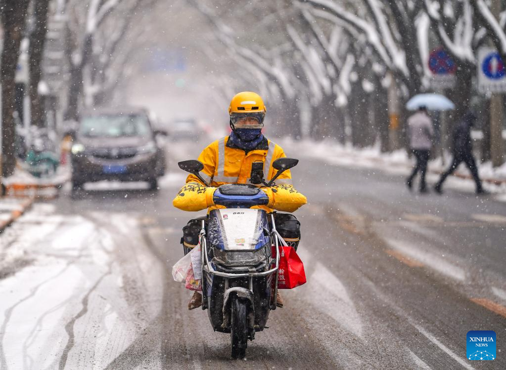 A deliveryman rides in the snow on Yangfangdian Road in Beijing, capital of China, Dec. 13, 2023. (Xinhua/Chen Yehua)