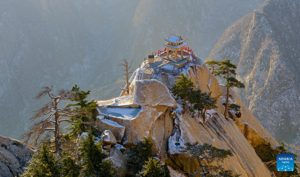 This photo taken on Dec. 12, 2023 shows the snow scenery of Huashan Mountain in Weinan, northwest China's Shaanxi Province. (Photo by Zhao Xiaogang/Xinhua)