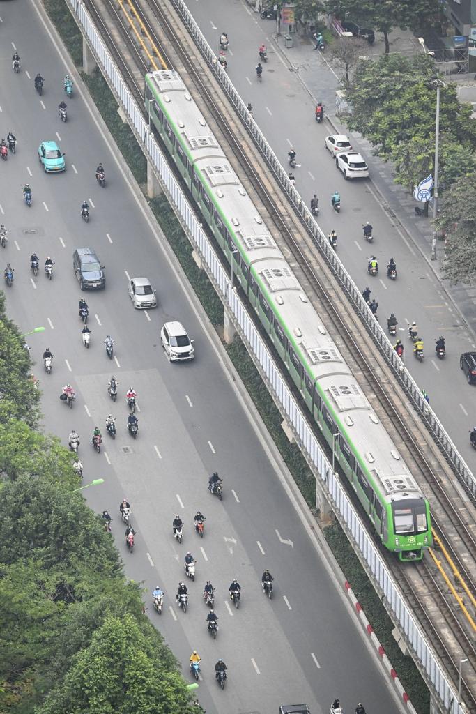 A train runs on the Cat Linh-Ha Dong urban elevated railway in Hanoi, Vietnam, Dec. 9, 2023. The railway was built by the China Railway Sixth Group as an important project of the synergy of China's Belt and Road Initiative with Vietnam's "Two Corridors and One Economic Circle" plan. (Xinhua/Cheng Yiheng)