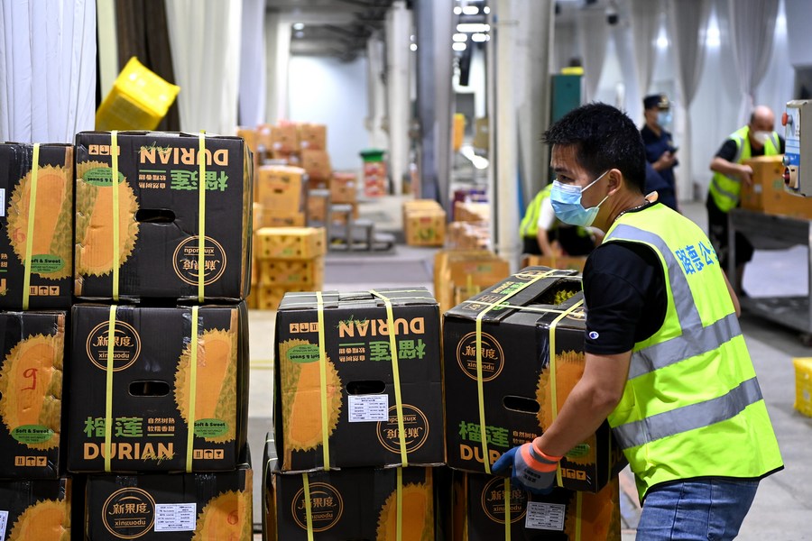 A staff member moves durians from Vietnam waiting for custom clearance at the port of the Friendship Pass in Pingxiang, south China's Guangxi Zhuang Autonomous Region, Sept. 12, 2023. (Xinhua/Cao Yiming)