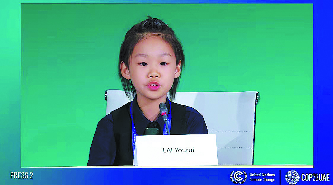 Lai Yourui, an 8-year-old student from Kunshan, Jiangsu province, felt a little lonely when he took part in the 28th Conference of the Parties to the United Nations Framework Convention on Climate Change, or COP28.