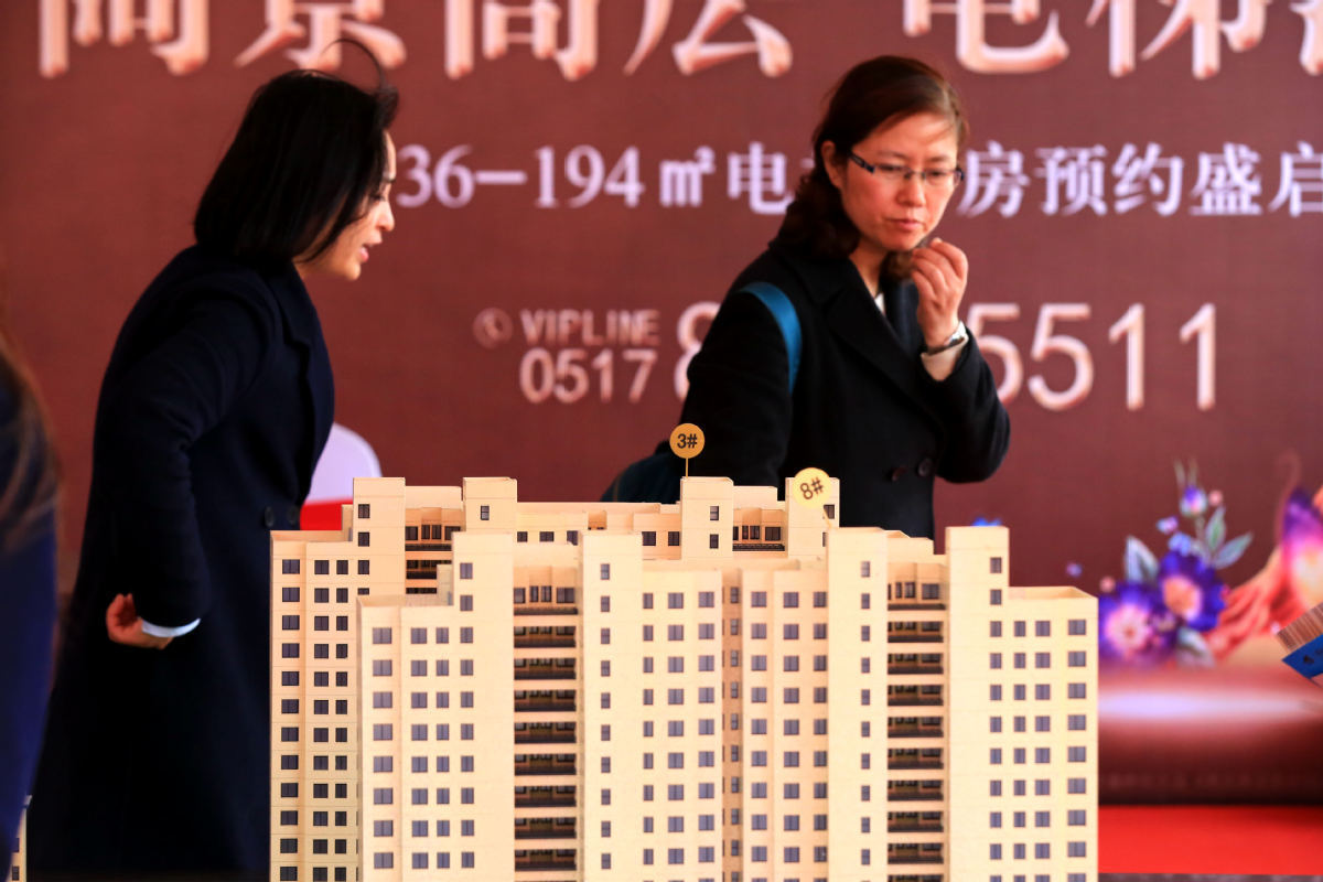 Potential homebuyers look at a property model in Huai'an, Jiangsu province. [Photo/China News Service]