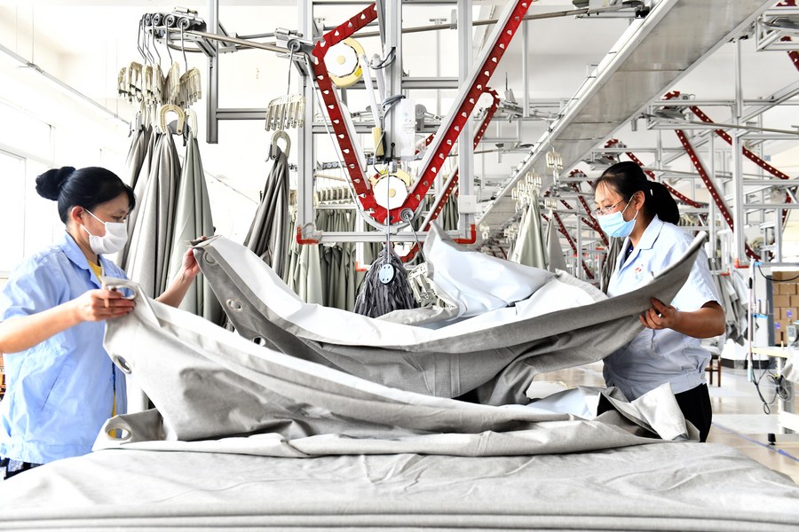 Workers process textile products at a home textile company in Wendeng district of Weihai, East China's Shandong province, July 21, 2023. [Photo/Xinhua]