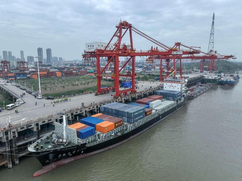 A container shipping route between Yangluo Port in Wuhan, central China's Hubei province and Cat Lai Port in Vietnam commences operations on Nov. 15, 2023. (People's Daily Online/Zhao Jun)