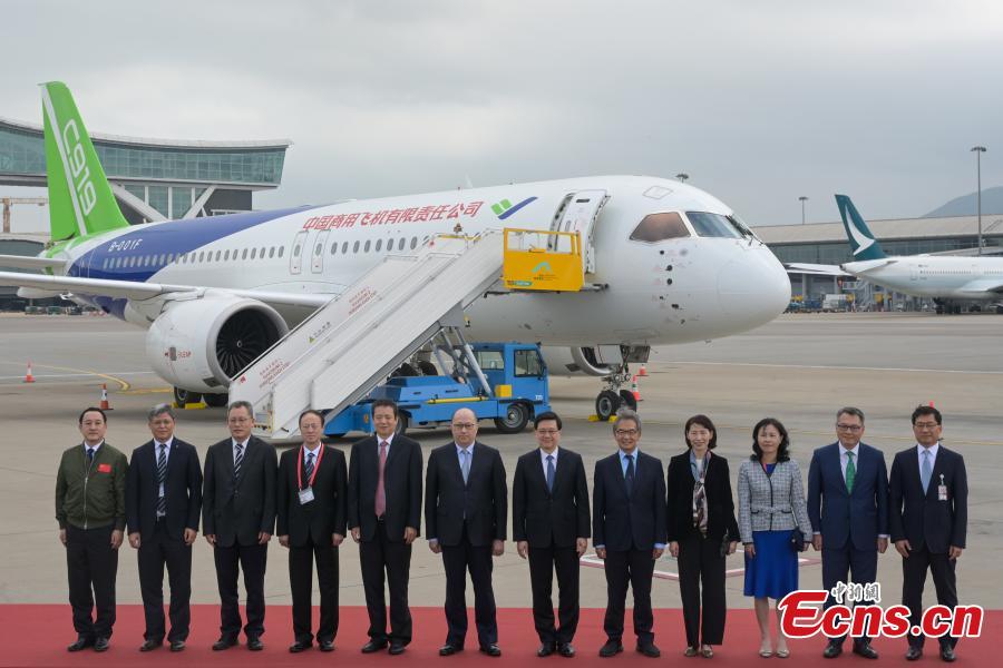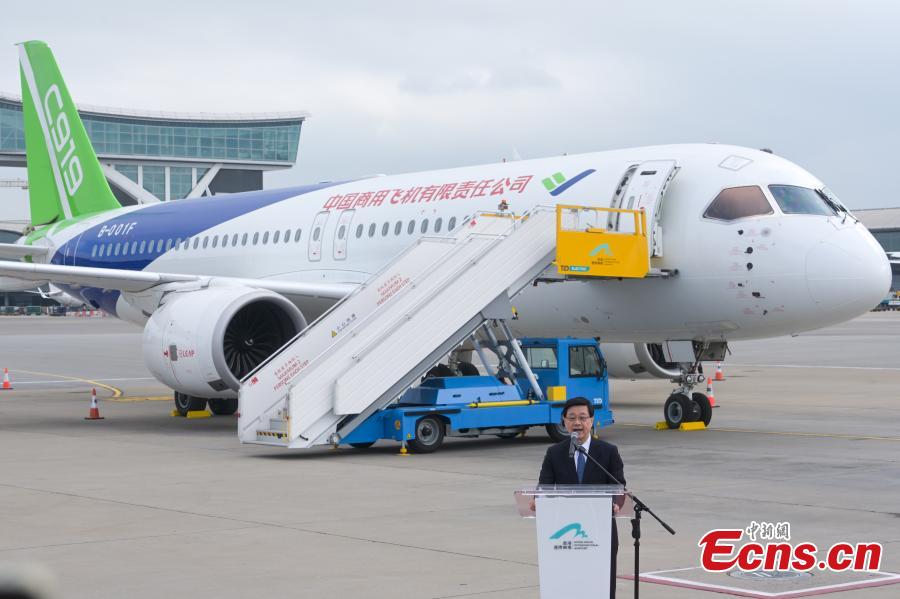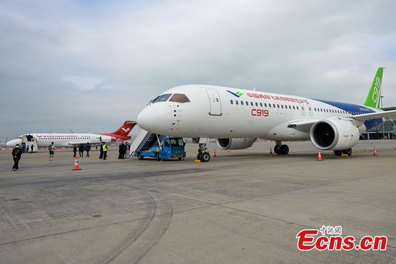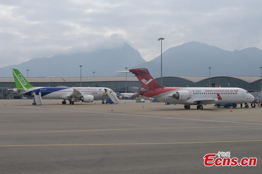 Two China's homegrown aircraft C919 (F) and ARJ21 stop at Hong Kong International Airport, Dec. 13, 2023. (Photo: China News Network/Chen Yongnuo)
