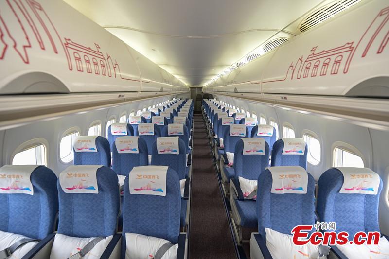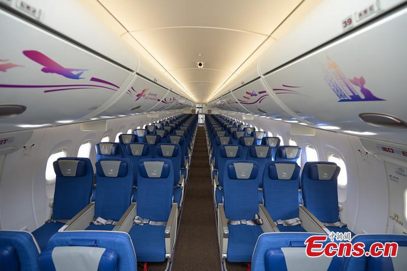 An interior view of China's homegrown ARJ21 aircraft displayed at Hong Kong International Airport, Dec. 13, 2023. (Photo: China News Network/Chen Yongnuo)