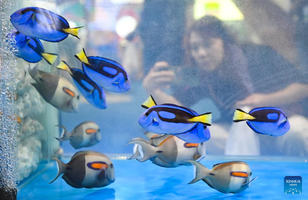 This photo taken on Dec. 14, 2023 shows ornamental fish bred by a biotechnology enterprise from Ledong County during the 26th China (Hainan) International Tropical Agricultural Products Winter Trade Fair in Haikou, south China's Hainan Province. Covering an area of around 80,000 square meters, the 26th China (Hainan) International Tropical Agricultural Products Winter Trade Fair kicked off here on Thursday. Exhibits of the four-day event will focus on fruits and vegetables, grain and oil, aquatic products, and cross-border e-commerce. (Xinhua/Guo Cheng)