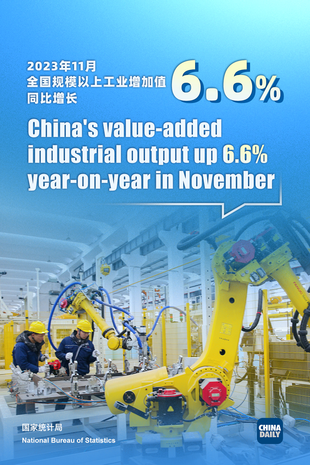 Figures released by the National Bureau of Statistics showed China's value-added industrial output - a gauge of activity in the manufacturing, mining and utilities sectors - grew by 6.6 percent from a year earlier in November, up from the 4.6 percent rise in October.