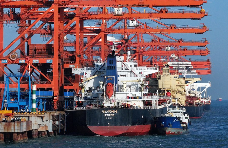 This aerial photo taken on Oct. 27, 2023 shows ships unloading cargo at the ore wharf of the Caofeidian port area of the Tangshan Port in north China's Hebei Province. (Xinhua/Yang Shiyao)