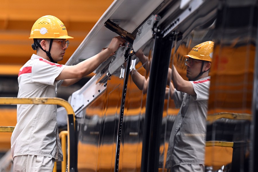 A staff member of China Railway Rolling Stock Corp (CRRC) Puzhen Alstom Transportation Systems Limited installs the equipment of a monorail carriage in Wuhu City, east China's Anhui Province, Sept. 13, 2023. (Xinhua/Zhou Mu)