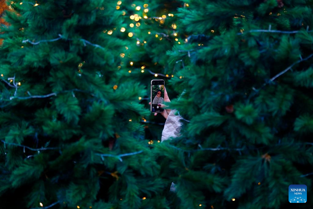 A visitor takes photos among Christmas decorations in Beirut, Lebanon, on Dec. 15, 2023. (Xinhua/Bilal Jawich)