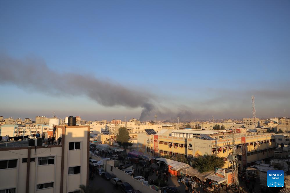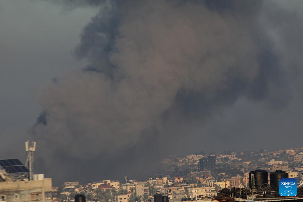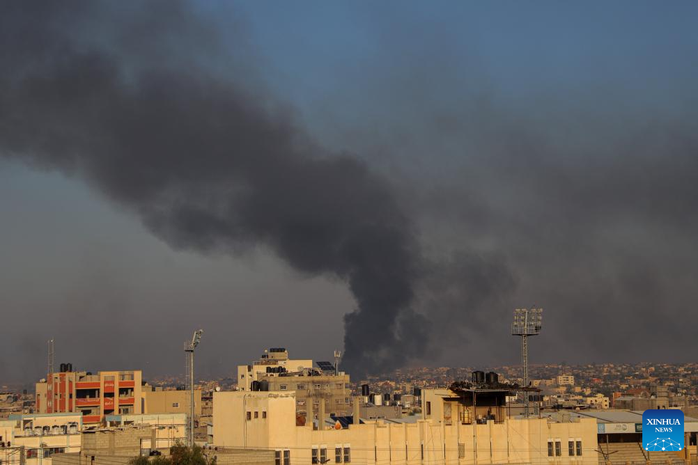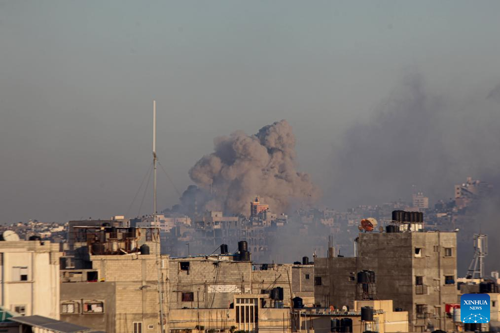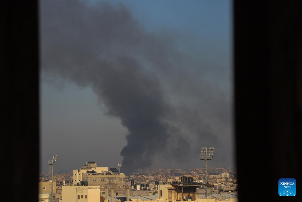 Smoke rises following an Israeli airstrike in the southern Gaza Strip city of Khan Younis, on Dec. 15, 2023. Israeli leaders told U.S. National Security Advisor Jake Sullivan on Thursday that Israel will continue its military offensive in the Palestinian enclave of Gaza Strip, despite the international calls for a ceasefire. (Photo by Rizek Abdeljawad/Xinhua)