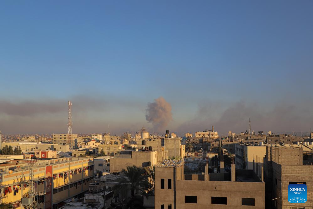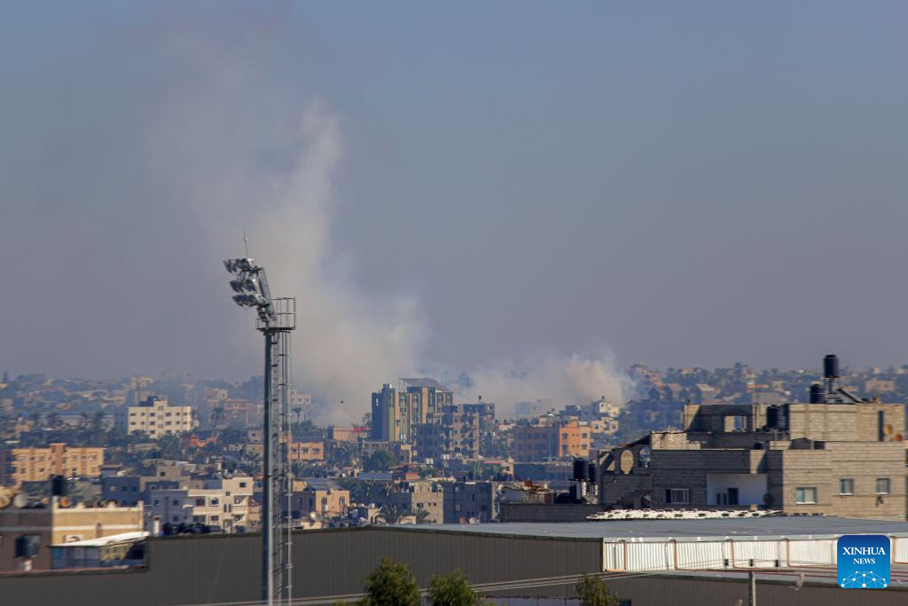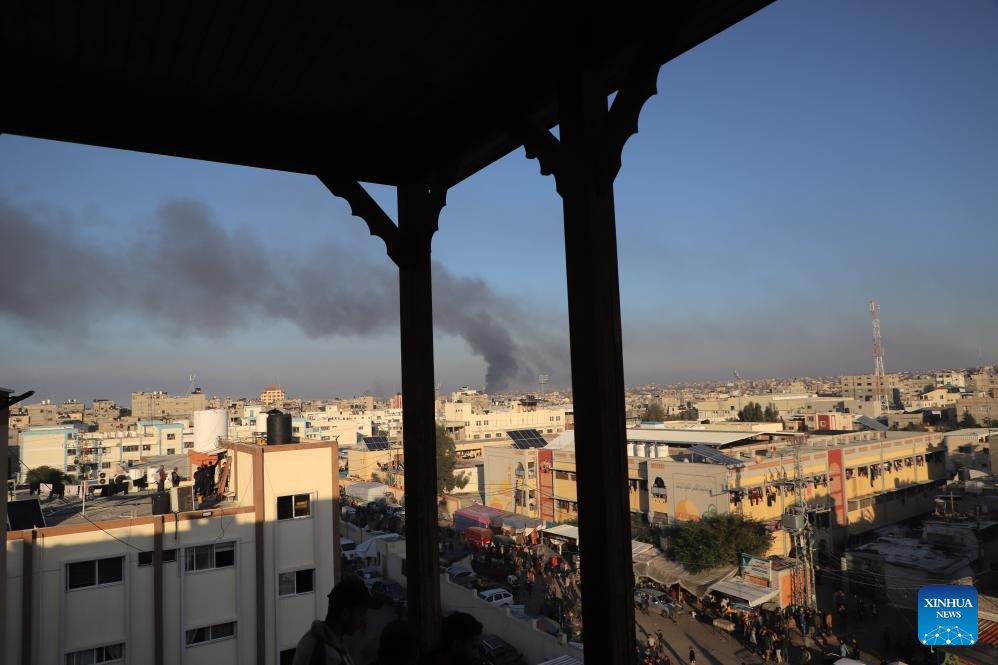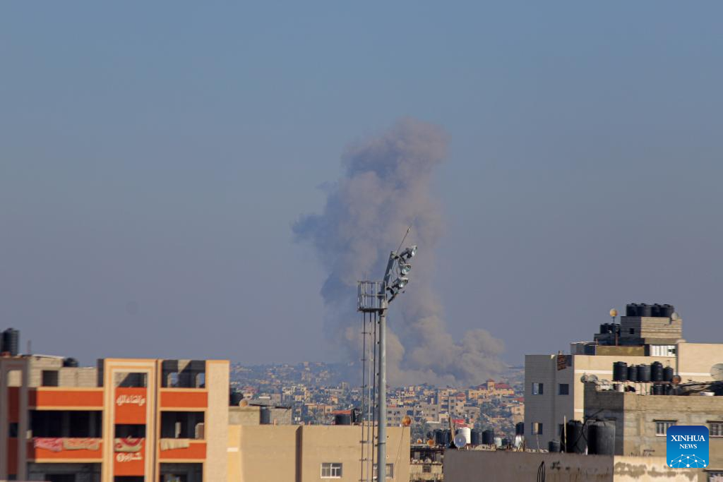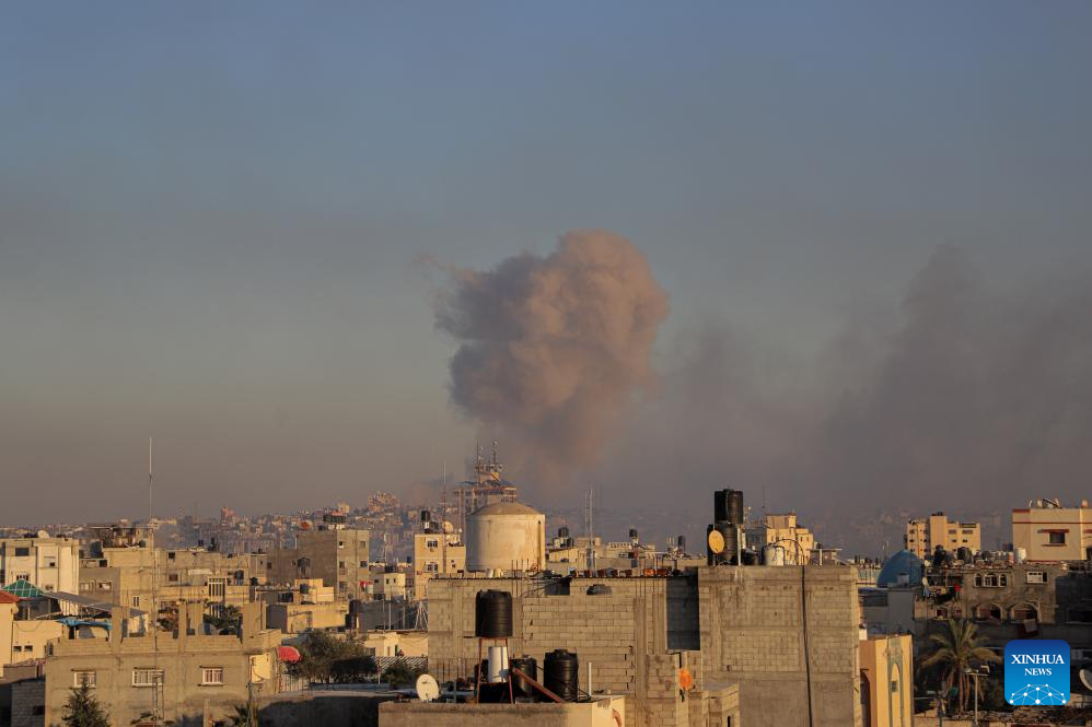 Smoke rises following an Israeli airstrike in the southern Gaza Strip city of Khan Younis, on Dec. 15, 2023. Israeli leaders told U.S. National Security Advisor Jake Sullivan on Thursday that Israel will continue its military offensive in the Palestinian enclave of Gaza Strip, despite the international calls for a ceasefire. (Photo by Rizek Abdeljawad/Xinhua)