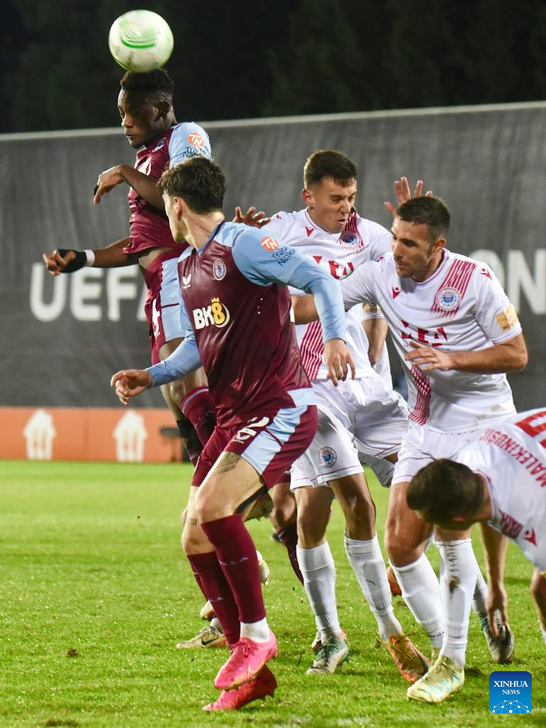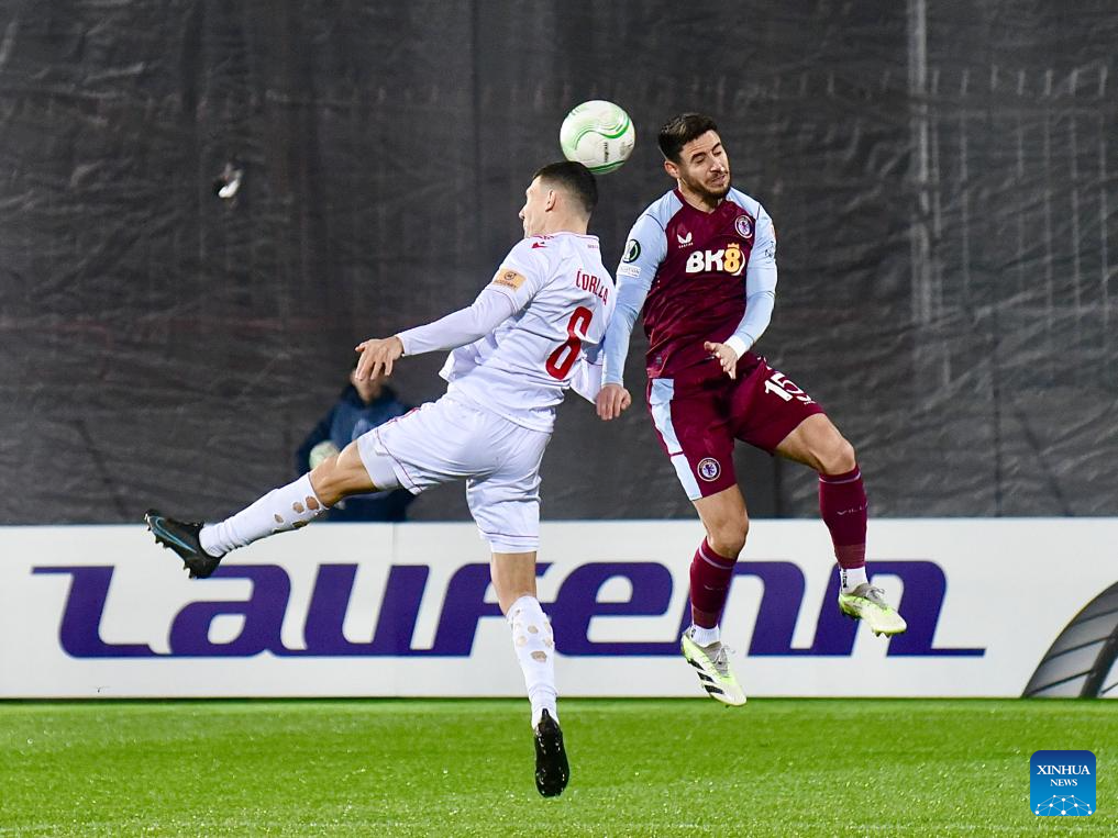 Ezri Konsa (1st L) of Aston Villa competes for a header during the Group E match between Zrinjski of Bosnia and Herzegovina and Aston Villa of England at 2023-2024 UEFA Europa Conference League in Mostar, Bosnia and Herzegovina on Dec. 14, 2023. (Photo by Ermin Zatega/Xinhua)