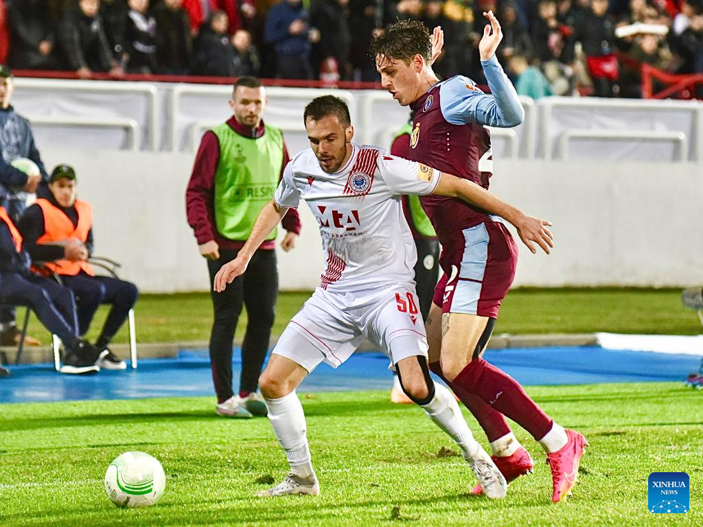Luka Marin (L) of Zrinjski vies with Matty Cash of Aston Villa during the Group E match between Zrinjski of Bosnia and Herzegovina and Aston Villa of England at 2023-2024 UEFA Europa Conference League in Mostar, Bosnia and Herzegovina on Dec. 14, 2023. (Photo by Ermin Zatega/Xinhua)