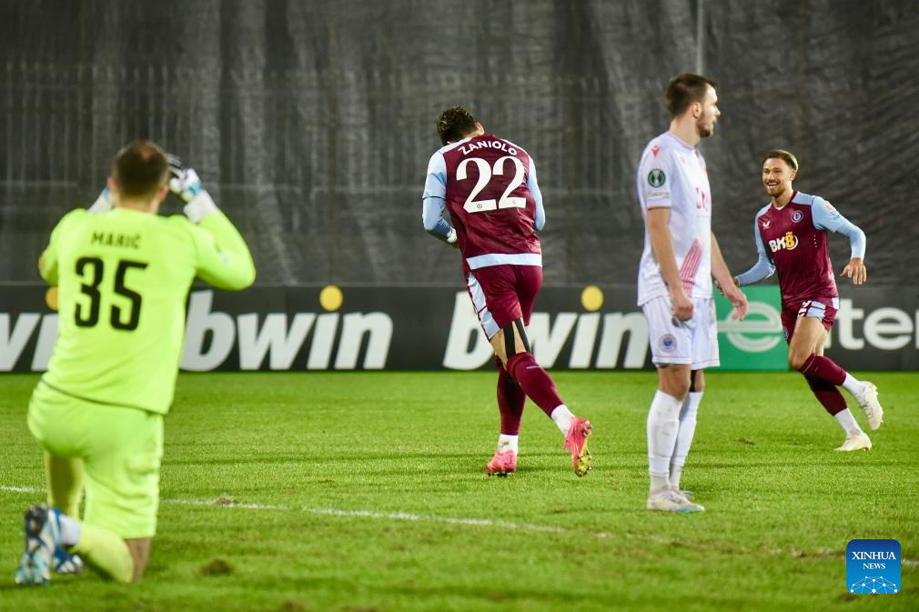 Nicolo Zanolo (2nd R) of Aston Villa celebrates his goal during the Group E match between Zrinjski of Bosnia and Herzegovina and Aston Villa of England at 2023-2024 UEFA Europa Conference League in Mostar, Bosnia and Herzegovina on Dec. 14, 2023. (Photo by Ermin Zatega/Xinhua)