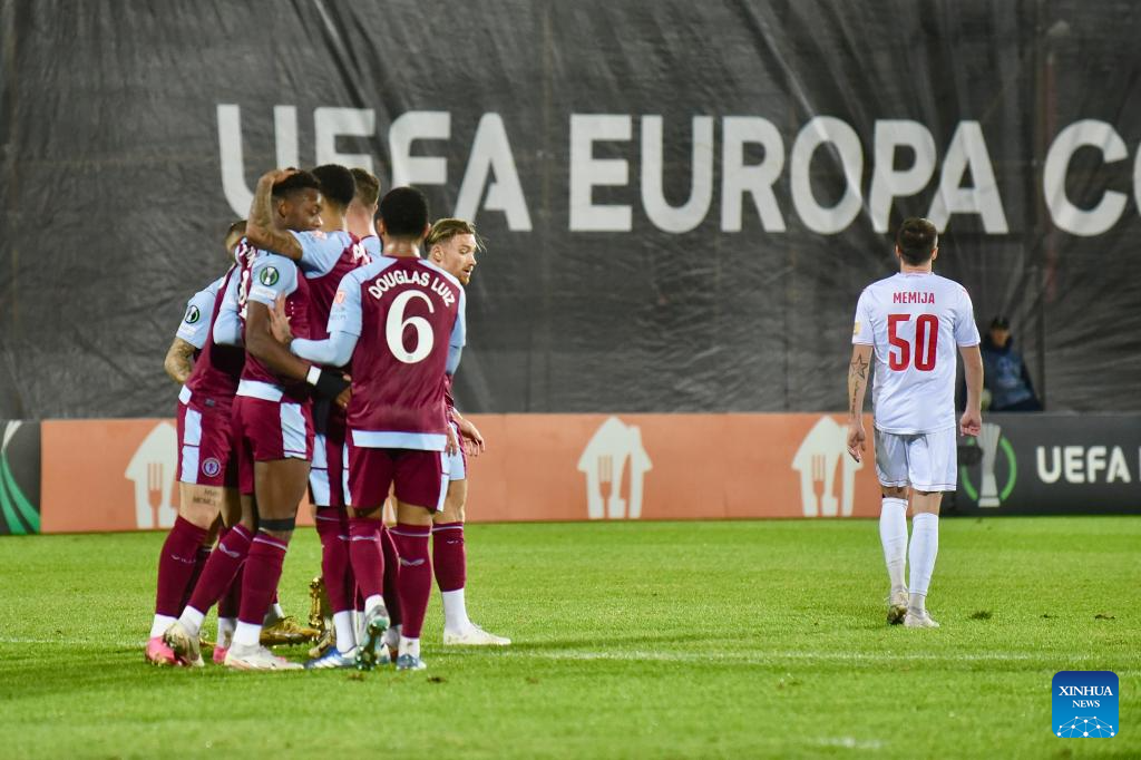 Players of Aston Villa celebrate their goal during the Group E match between Zrinjski of Bosnia and Herzegovina and Aston Villa of England at 2023-2024 UEFA Europa Conference League in Mostar, Bosnia and Herzegovina on Dec. 14, 2023. (Photo by Ermin Zatega/Xinhua)