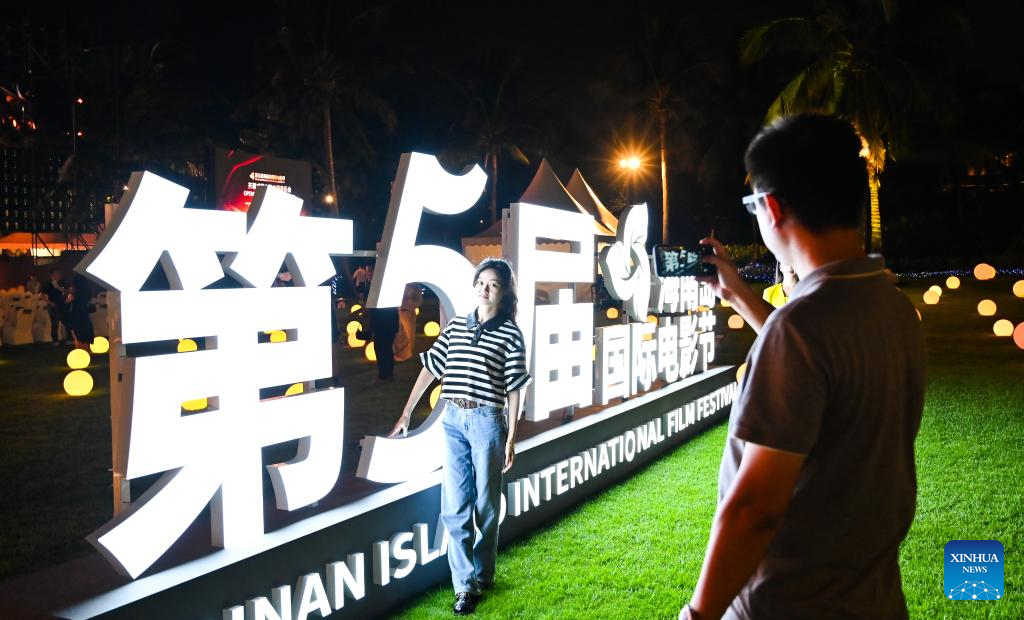 People take a selfie during the opening ceremony of the 5th Hainan Island International Film Festival in Sanya, south China's Hainan Province, Dec. 16, 2023. The festival runs from Dec. 16 to 22. (Xinhua/Fan Yuqing)