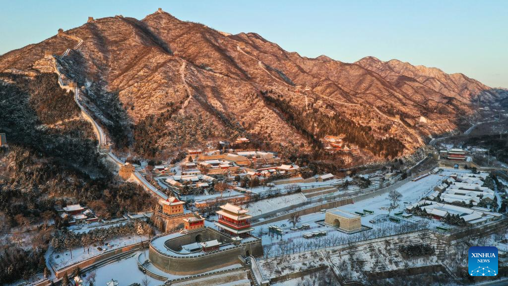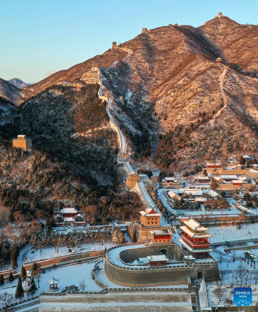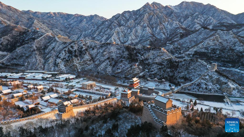 This aerial photo taken on Dec. 16, 2023 shows the snow scenery at the Juyongguan section of the Great Wall in the sunlight in Beijing, capital of China. (Xinhua/Chen Yehua)