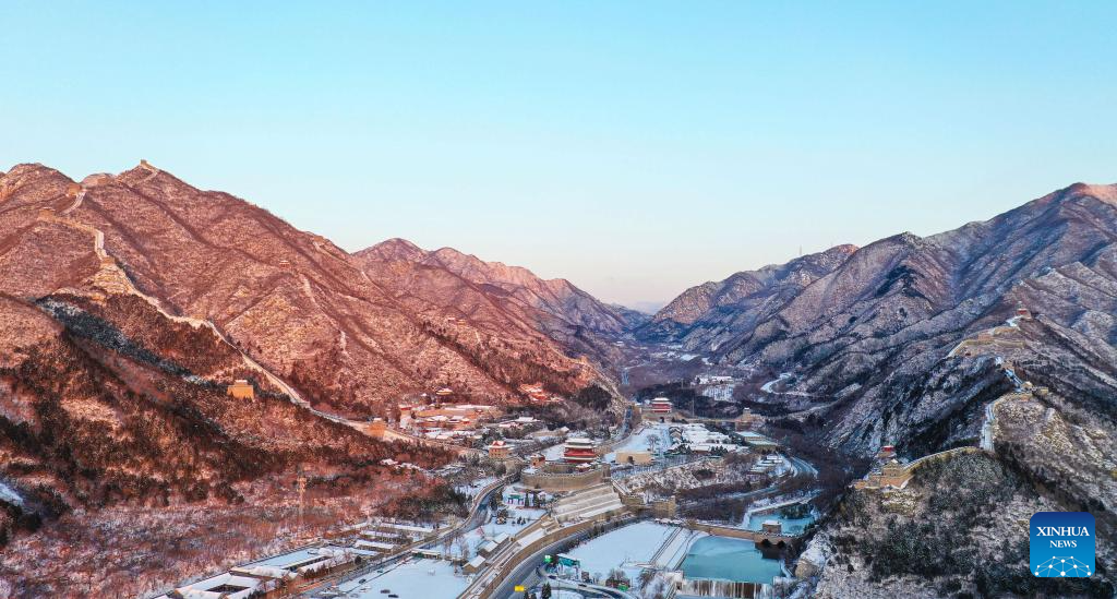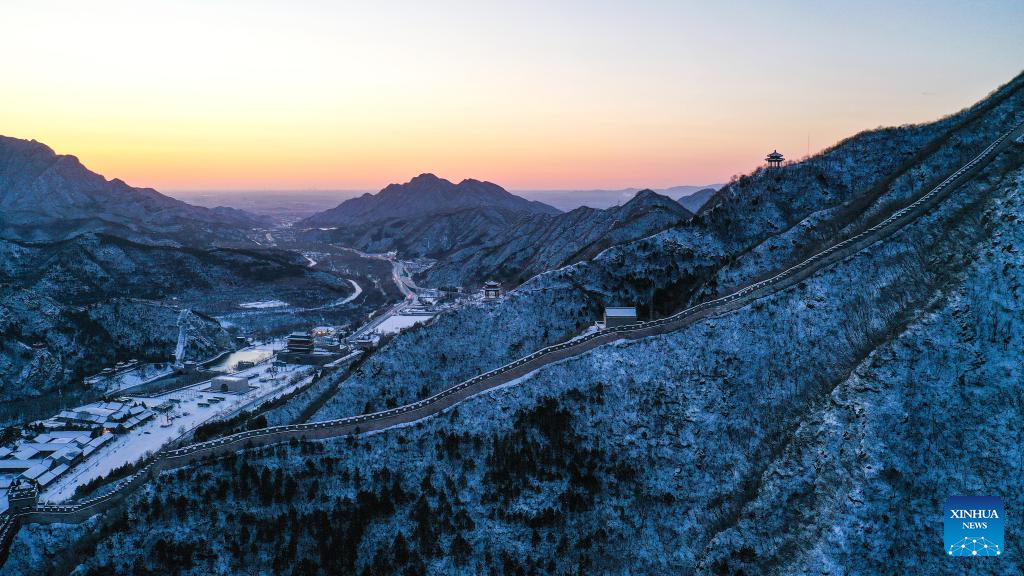 This aerial photo taken on Dec. 16, 2023 shows the snow scenery at the Juyongguan section of the Great Wall at sunrise in Beijing, capital of China. (Xinhua/Chen Yehua)