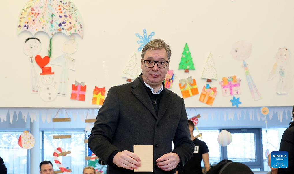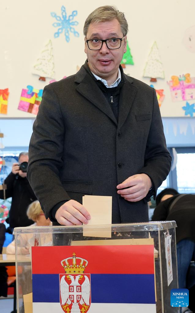 Serbian President Aleksandar Vucic casts his ballot at a polling station in Belgrade, Serbia, on Dec. 17, 2023. (Photo by Predrag Milosavljevic/Xinhua)