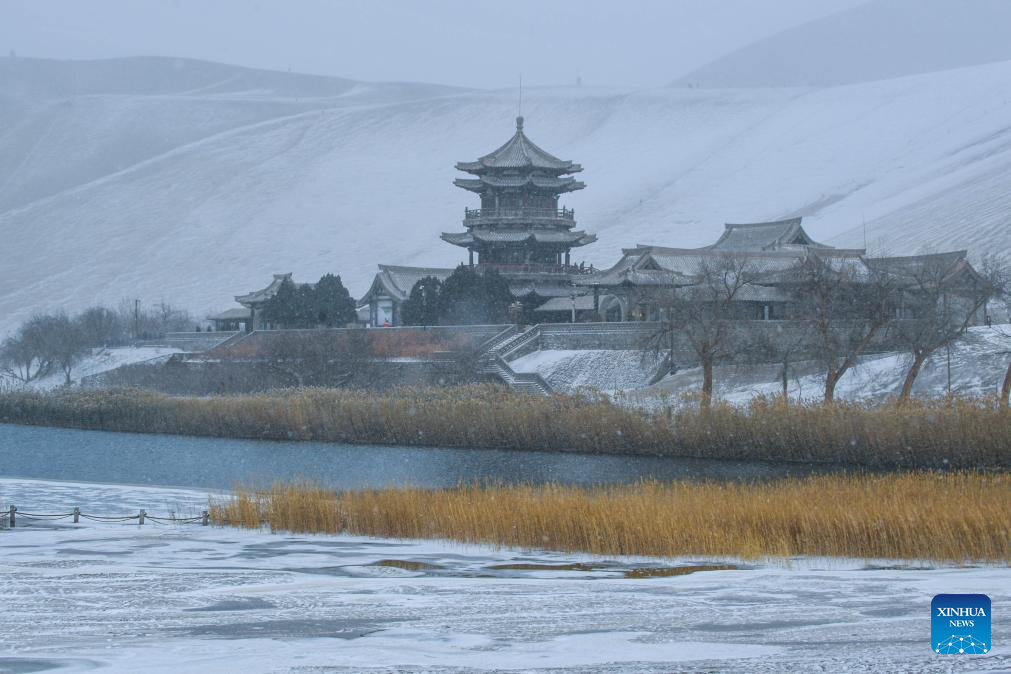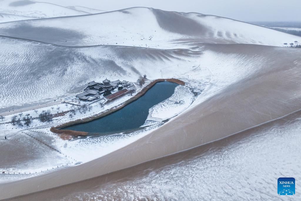 This photo taken on Dec. 14, 2023 shows the Mingsha Mountain and Crescent Spring scenic spot in Dunhuang City, northwest China's Gansu Province.?(Xinhua/Lang Bingbing)
