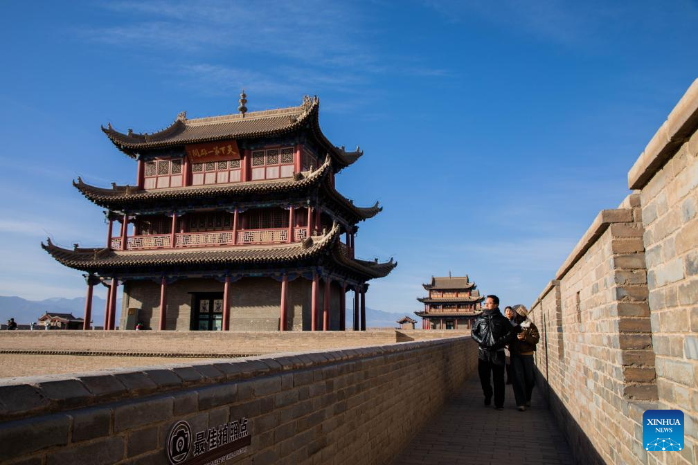 Tourists visit the Jiayu Pass scenic area in Jiayuguan City, northwest China's Gansu Province, Dec. 12, 2023.?(Xinhua/Lang Bingbing)
