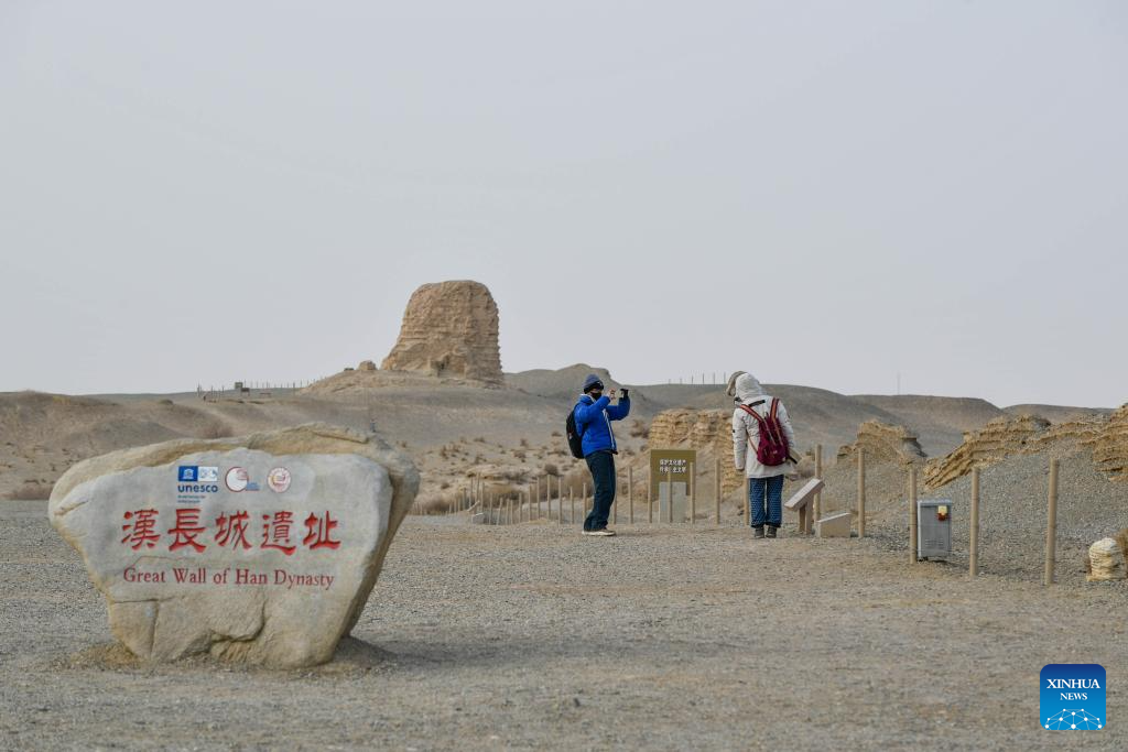Tourists visit the Great Wall of Han Dynasty in Dunhuang City, northwest China's Gansu Province, Dec. 13, 2023. (Xinhua/Lang Bingbing)
